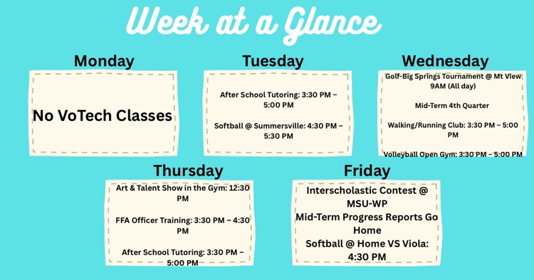 Week at a Glance March 30-April 3 brought to you by the Introduction to Business class!!
