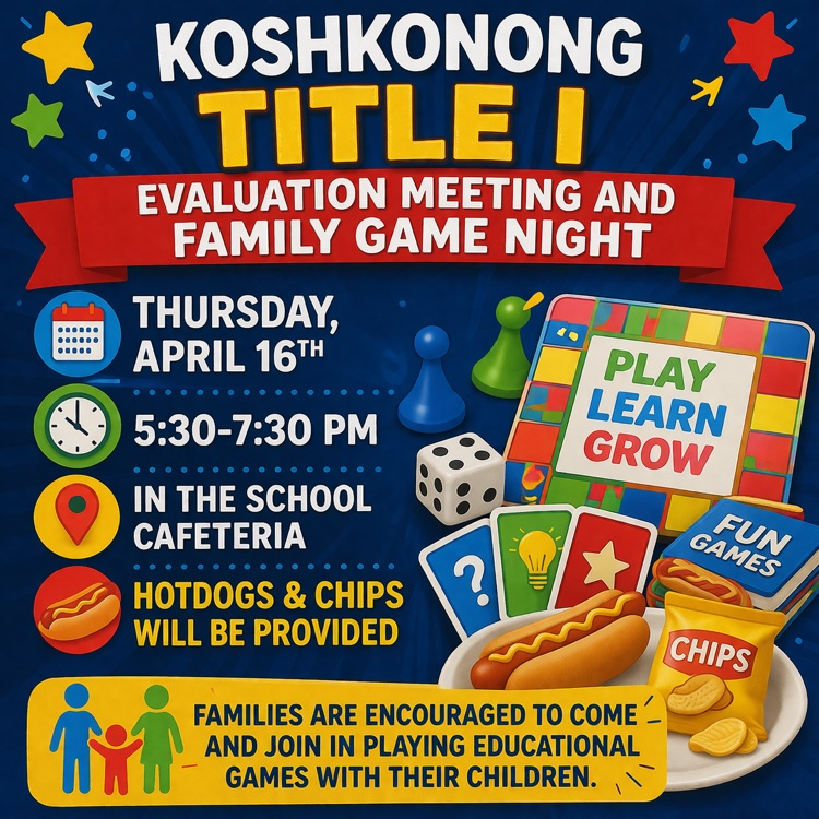 🎲📚 Koshkonong Title I Family Game Night! 🌭🎉 Join us for an evening of fun, learning, and family time at our Title I Evaluation Meeting & Family Game Night!! 🗓 Thursday, April 16th ⏰ 5:30–7:30 PM 📍 Cafeteria Enjoy a relaxed evening playing educational games with your children while connecting with our school community. 🌭 Hotdogs & chips will be provided!! Bring the whole family and come ready to play, learn, and grow together!!💙 #Koshkonong #FamilyGameNight #TitleI #BluejayPride #PlayLearnGrow