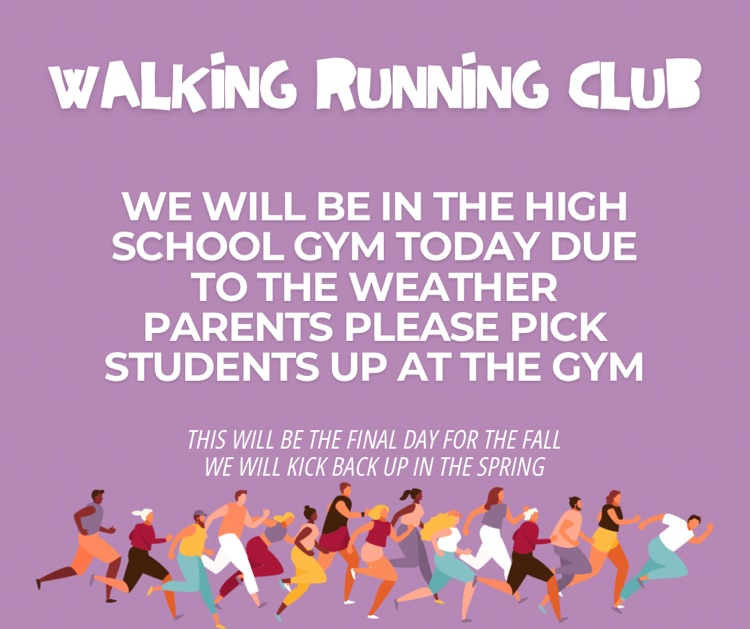 Walking Running Club will meet in the high school gym today due to the weather. Parents, please pick students up at the gym. This will be our last day for the fall and will begin our days again in the spring.