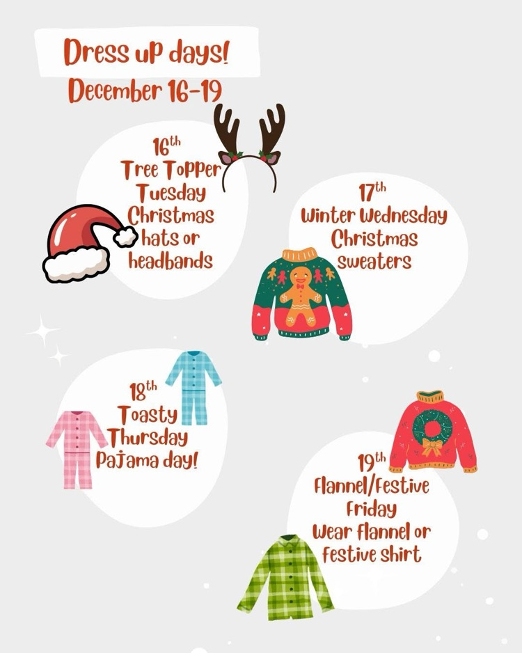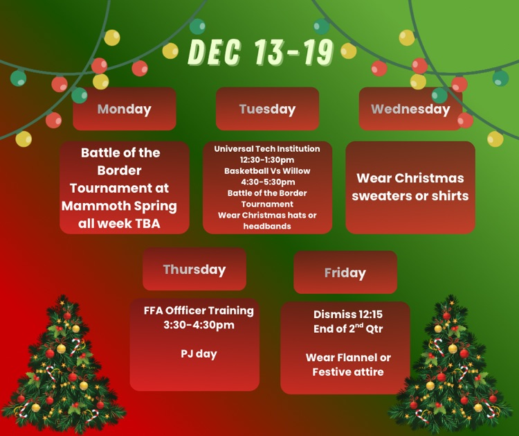 Exciting week as we finish our fall semester with the PTO Santa Store, Spirit days, Battle of the Border, and classes will dismiss Friday at 12:15pm. Be sure to join in the fun beginning with Tree Topper Tuesday!!